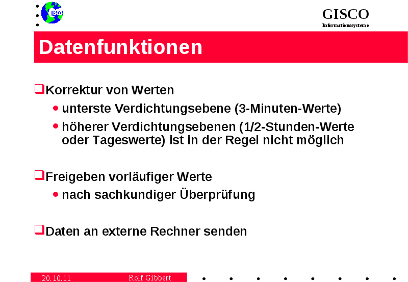 Die Funktion ermöglicht die Korrektur von Werten der untersten Verdichtungsebene, üblicherweise sind dies die 3-Minuten-Werte. Eine Korrektur von aus 3-Minuten-Werte gebildeten 1/2-Stunden-Werte oder Tageswerte ist nicht möglich. Nachdem die Wertekorrektur oder das Eintragen neuer Werte abgeschlossen ist, muß automatisch die Verdichtung der Werte erfolgen um die Konsistenz der geänderten Daten zu gewährleisten.
