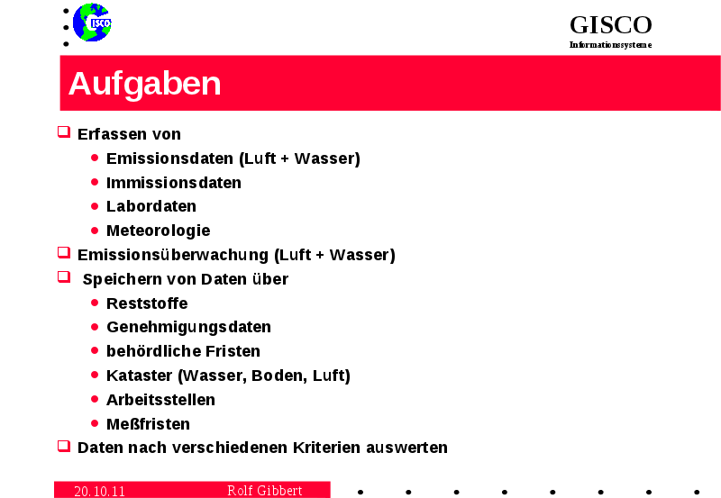 Bei der Systemkonzeption wird zwischen den Aufgaben eines Umweltüber-wachungs(monitoring)systems (UMS) und eines Umweltinformationssystems (UIS) unterschieden. Beim UMS liegt der Schwerpunkt auf der Erfassung der Daten, insbesondere durch Meßsysteme. Beim UIS liegt die Betonung auf der Auswertung und Präsentation der Daten und Informationen sowie bei der Unterstützung von umweltbezogenen Planungs- und Verwaltungsvorgängen. Dabei spielen dann auch Daten eine Rolle, die nicht aus Meßsystemen stammen.